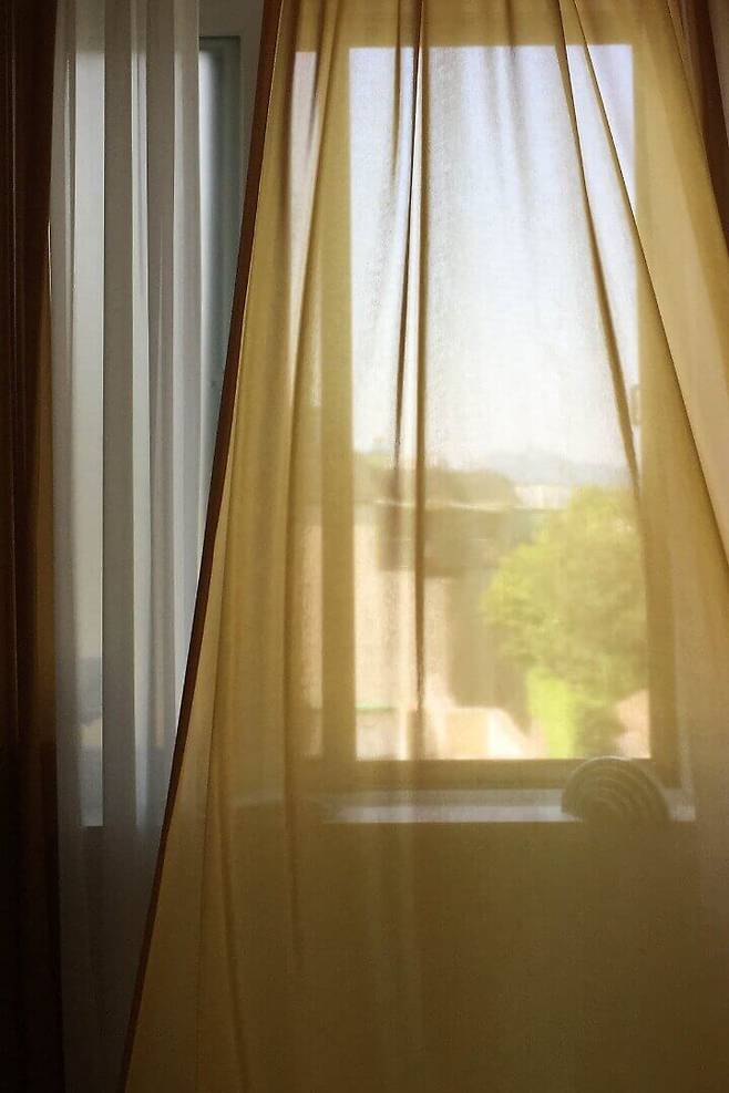 좁은 공간의 침실에 하얀 침구나 소품만 두다보니 삭막한 느낌이 조금 있더라구요. 그래서 따뜻한 느낌의 오렌지 커튼을 설치했어요. 해가 비치지 않을 땐 오렌지이고, 햇빛이 있을 때면 노란색입니다. :) 속 커튼은 웜화이트로 두겹을 설치했어요.