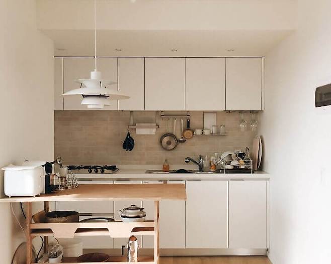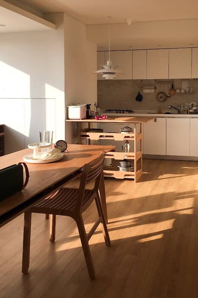 테이블 : MOEM Double Table_Oak / 의자 : MOEM T-Chair_Oak / 주방 수납선반 : MOEM / 주방등 : Louis Poulsen PH 5 White Classic / 트레이 : vitra 로터리 트레이 화이트 / 전기 토스터 : 무인양품 전기 토스터