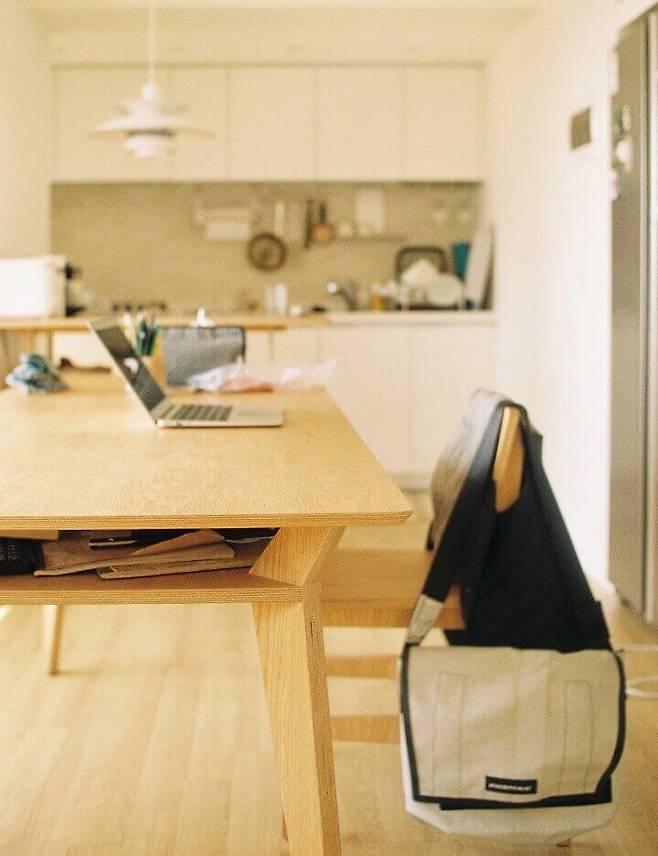 저희 부부는 주로 이 테이블에서 밥을 먹고 각자의 일을 하는 편이에요. 식탁과 작업 테이블을 겸비할 수 있도록 일부러 큰 사이즈로 제작했어요. 상판 밑의 공간에는 노트북이나 노트, 가벼운 서류들을 보관하고 있어요.