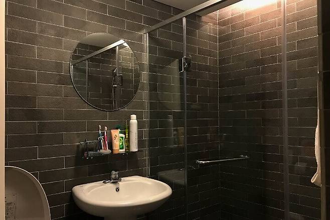 이제껏 보여 드린 공간과는 다르게 화장실은 블랙 컨셉이에요. 실제로 보면 살짝 러프한 돌 타일이에요. 덕분에 화장실이 더욱 멋스럽게 느껴지는 것 같아요.