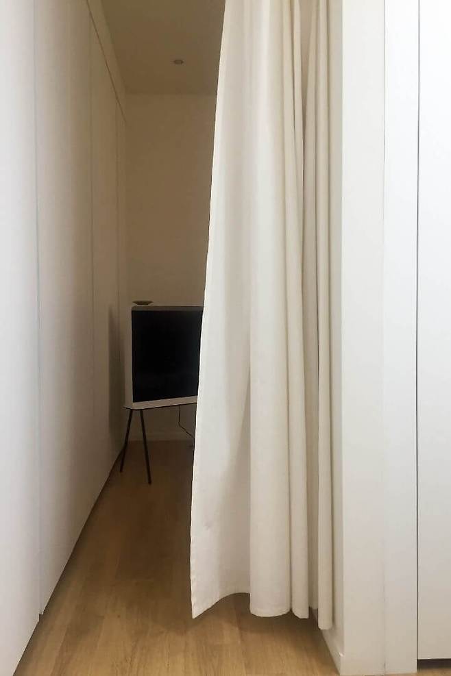 아치 통과 후 바로 왼쪽으로 시선을 돌리면 침실이 나타나요. 어찌 보면 침실이랑 드레스룸은 한 공간에 있다고 말해도 과언이 아니죠. 대신 커튼을 설치해 공간을 분리했습니다.