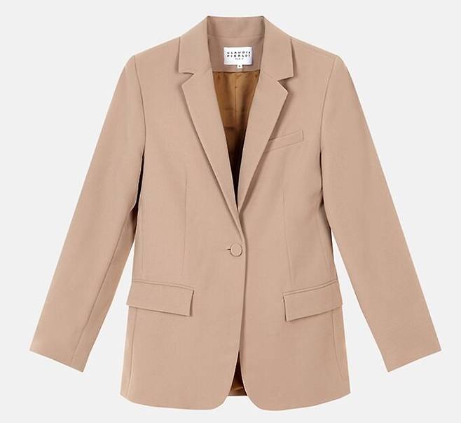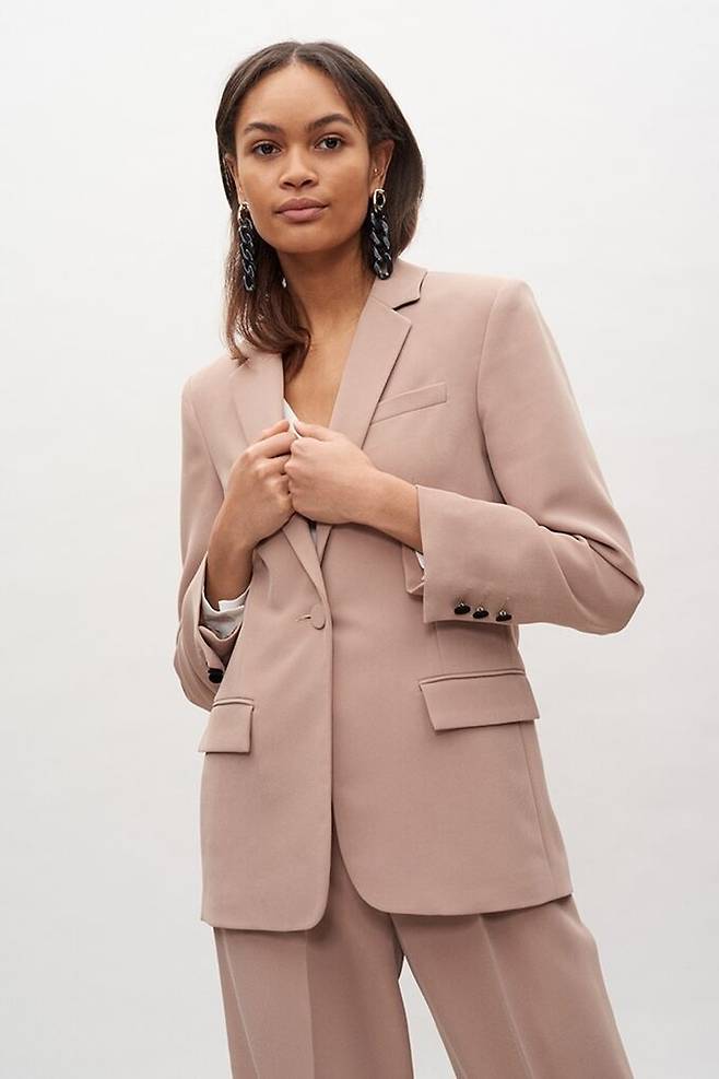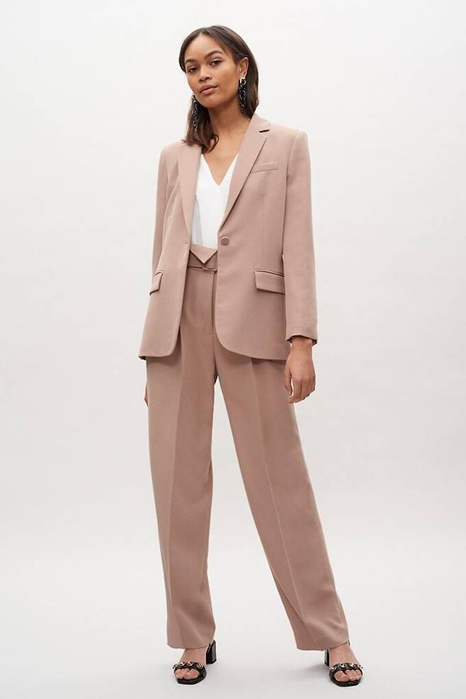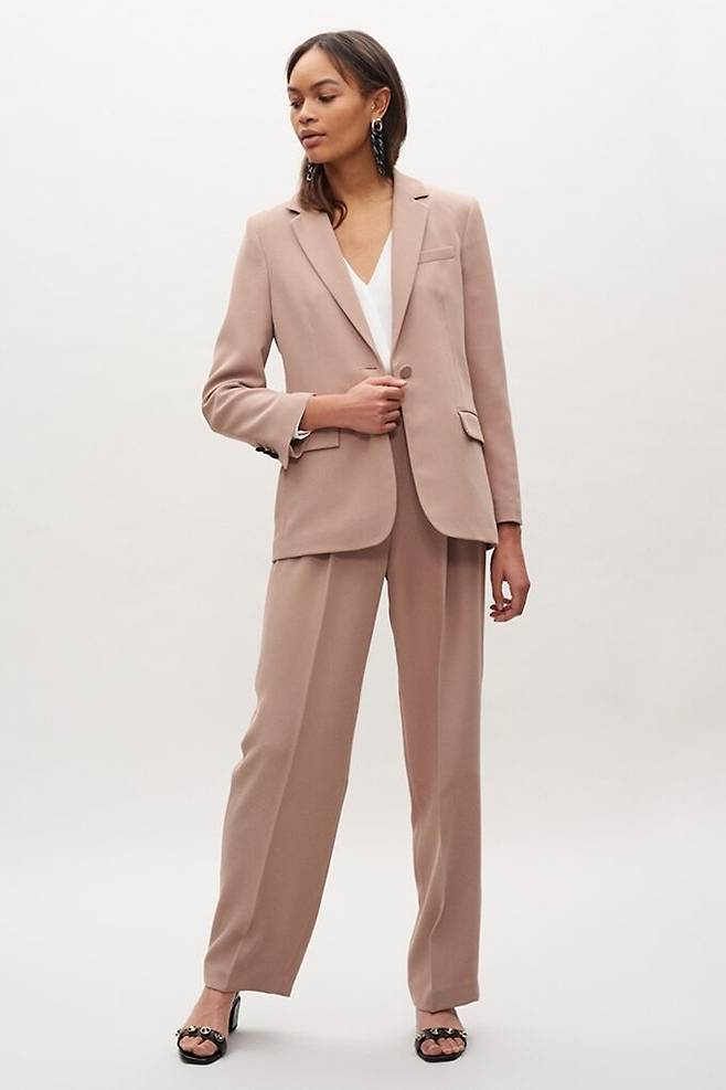 베이지 컬러의 부드러운 느낌의 재킷과 팬츠 셋업으로 구성, 시크하고 모던한 분위기를 연출한다.