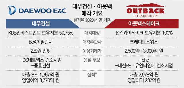 대우건설(047040) 매각 입찰에 DS네트웍스·스카이레이크에쿼티파트너스·IPM 컨소시엄과 중흥건설 두 곳이 참여했다. 본입찰에 임박해 자문단을 선정하며 응찰 준비에 나섰던 호반건설은 결국 응찰하지 않았다. 같은 날 치러진 아웃백스테이크하우스 입찰에는 치킨 업체 bhc와 사모펀드(PEF) 운용사 대신프라이빗에쿼티(PE)·유안타인베스트먼트 컨소시엄이 뛰어들었다.