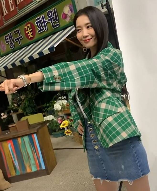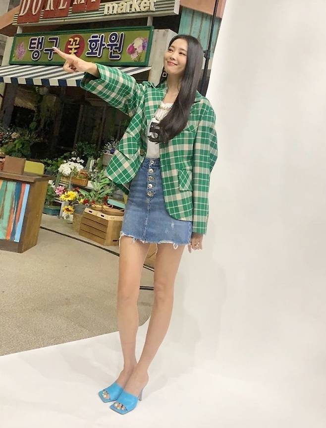데님 숏스커트에 그린 체크 무늬 재킷 170Cm의 늘씬한 각선미 과시