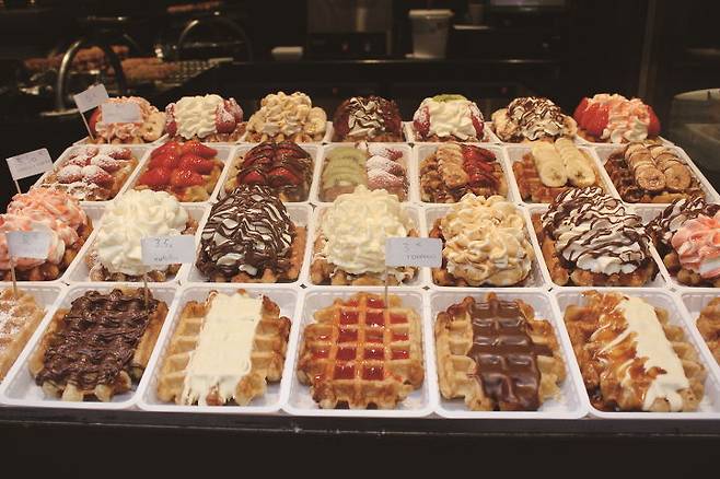 한국의 붕어빵처럼 흔한 벨기에 간식이 와플이다. 와플의 나라인 만큼 벨기에에서는 도시마다 만드는 방식과 맛, 식감이 다르다. 브뤼셀 와플은 직사각형 케이크 모양으로 달걀흰자가 들어가 겉은 바삭하고 속은 부드럽다. 단맛이 약해 위에 과일, 시럽, 아이스크림 등 달콤한 토핑을 얹어 먹는다. 부먹으로 먹든 찍먹으로 먹든 자유다. 리에주 와플은 격자무늬가 있는 동그란 과자 모양으로, 브뤼셀 와플보다 쫀득쫀득하고 크기가 작다. 보통 포장마차에서는 리에주 와플을 많이 판다.