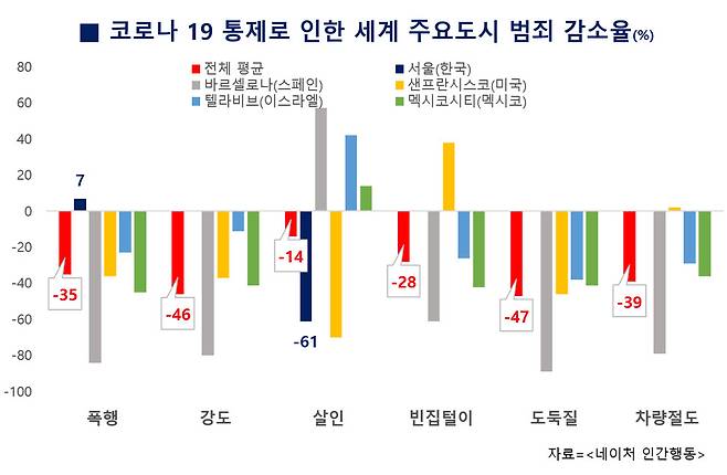 서울의 경우 폭행은 7% 증가한 반면 살인은 61% 감소한 것으로 집계됐다. 연구팀은 서울 자료의 경우 빈집털이와 강도, 일반절도와 차량절도가 구분되지 않아 개별 범죄유형별 통계는 내지 않았다고 밝혔다. 논문 공저자인 박형민 한국형사법무정책연구원 범죄조사연구실장은 “일부 통계가 빠진 것은 연구팀의 분석 방법과 한국의 범죄 유형별 통계가 일치하지 않아서이다. 또 분석 대상인 서울의 일일 범죄 건수가 적어 범죄별 증감률은 통계적으로 의미가 없는 수치다”라고 설명했다.