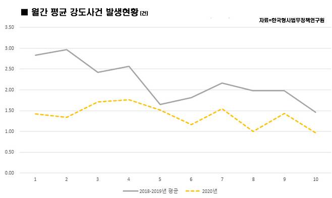보고서는 지난해 우리나라 10대 범죄 가운데 절도와 폭력, 사기 등의 발생 건수가 코로나19 대유행 영향으로 이전에 비해 줄어든 것으로 분석했다. 절도의 경우 지난해 2월 코로나19 발생 이전까지는 증가 추세를 보였으나 이후에 감소했다. 폭력은 지난 3년 동안 8~9월까지 증가하다 다시 감소하는 주기성을 보이던 것이 지난해에는 주기성이 약해지며 전반적인 감소 추세를 보였다. 사기 범죄는 지난 2년 동안 지속적으로 증가하는 추세를 보이다 지난해에는 조금씩 감소하는 경향으로 돌아섰다.