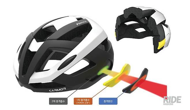 자전거 대 자동차의 사고 유형을 관찰한 결과에 따르면, 라이더는 차량과의 충돌로 1차 충격을 받자마자, 바닥으로 낙하면서 2차 충격으로 인해 두개골에 반복적인 충격이 가해질 수 있다. 1차 충격에 헬멧의 EPS폼에 손상이 되더라도 헬멧 내부의 포론 소재가 반복되는 충격을 흡수하여 두개골의 손상을 최대한 막아준다.