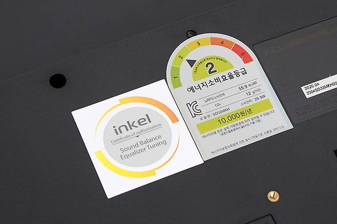 뒷면을 보면 에너지소비효율등급을 알리는 스티커가 부착되어 있는데, 이 제품은 2등급으로 표시되어 있다. 표준시험환경에서 하루 6시간 가동했을 때 1년에 1만 원 정도의 전기 요금이 발생한다고 하니 상당히 효율이 높다고 할 수 있어서 전기 요금 걱정 없이 즐길 수 있겠다. 에너지소비효율등급 바로 옆에는 인켈의 사운드 튜닝을 알리는 스티커도 부착되어 있는데, 오래전부터 국내 최고의 오디오 브랜드로 잘 알려졌기 때문에 기대감을 높일 수 있다.