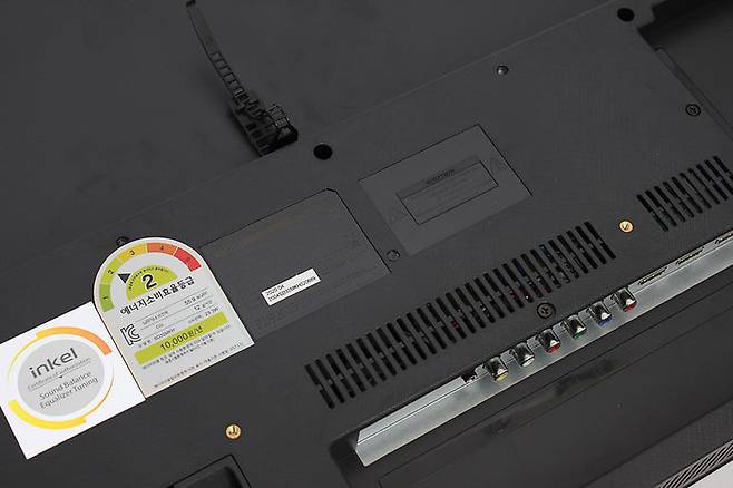 에너지소비효율등급 스티커 옆을 보면 네 개의 나사구멍이 보이는데, 베사 표준 마운트 홀이다. 규격은 100x200mm로, 벽걸이 스탠드를 따로 구매하면 탁상용이 아닌 벽걸이용으로도 사용할 수 있다.