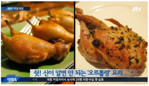 요리 레시피가 너무 잔인해요. 오르톨랑이 앞을 못 보게 눈을 뽑고, 어두운 상자에 가둬 한 달 정도를 무화과, 포도 등을 엄청나게 먹여 살을 뒤룩뒤룩 찌워요. 그리고 눈이 멀고 살이 찐 새를 술에 담가 익사시켜 만드는 요리예요. 현재 이 새를 잡거나 먹으면 벌금이 부과된다네요.
