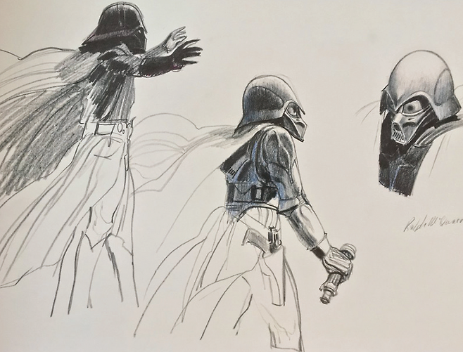<스타워즈>의 콘셉트 디자이너인 랠프 매쿼리가 디자인한 초기 다스 베이더는 루카스의 제안에 따라 전통 베두인 복장을 한 모습이에요. 다스 베이더가 영화에서 처음 등장하는 것은 제국군의 비행선이 공화국군의 비행선을 침략하는 장면에서에요. 매쿼리는 한 우주선에서 다른 우주선으로 이동해야 한다면, 우주 공간을 통과할 테니 호흡 장치 같은 게 있어야 한다는 아주 기초적인 과학적 사고를 했어요.