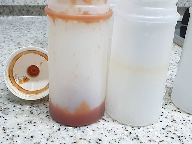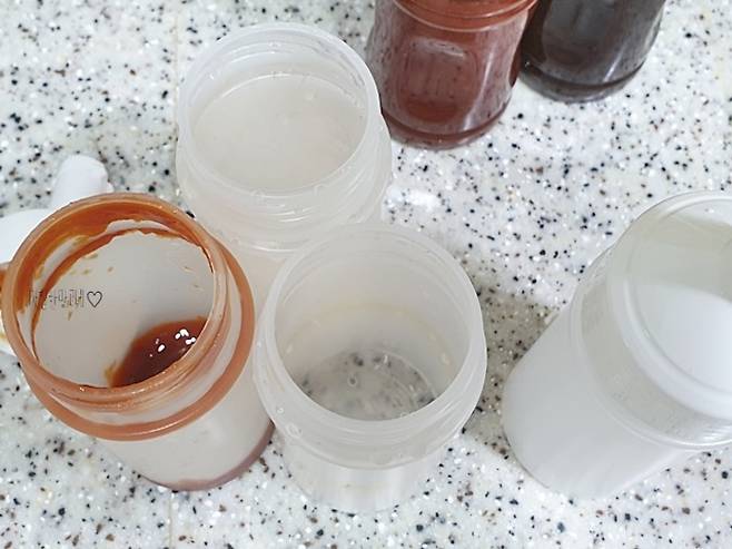 아무래도 양념들이 담겨져 있던 시간들이 있어서 그런지 완전히 다 지워지진 않았지만, 처음보단 많이 깨끗해졌죠? 이제 다시 케찹과 액젓을 넣고 사용할 거예요.