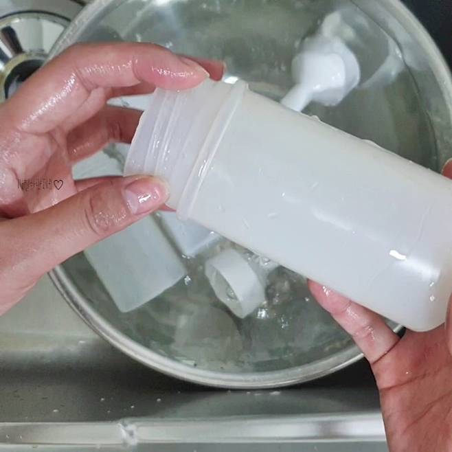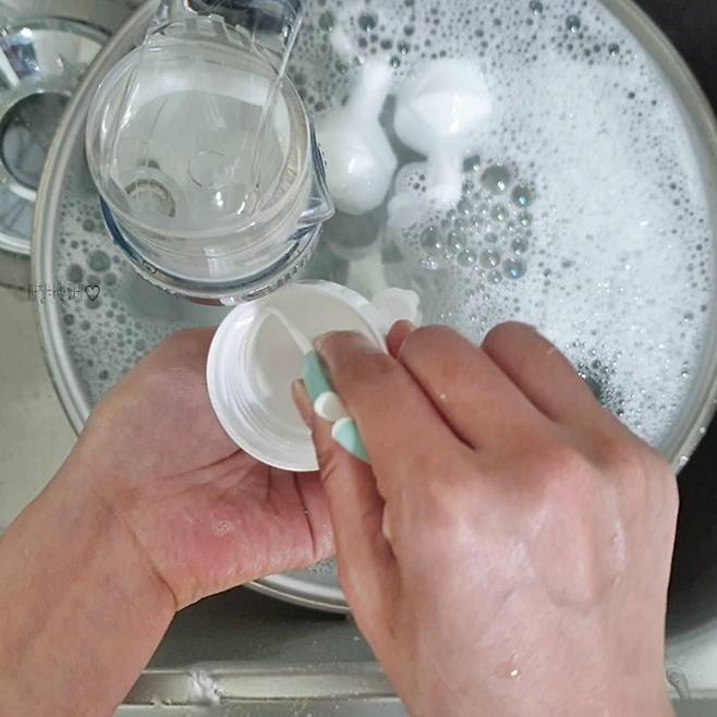 그 다음 세척솔로 양념통과 뚜껑 모두 깨끗하게 세척을 해요. 이때 뜨거운 물로 할 경우 양념통에 변형이 생길 수 있으니 미지근한 물을 사용해주세요.
