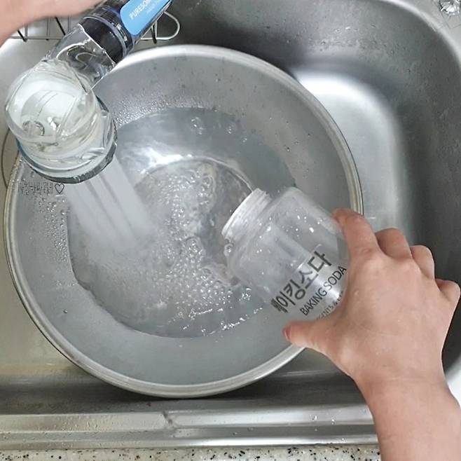 세척한 양념통을 베이킹소다와 식초 푼 물에 잠시 담가줍니다. 그리고 잠길 수 있을 정도로 물을 채운 후 베이킹소다를 한번 더 넣어주었답니다.