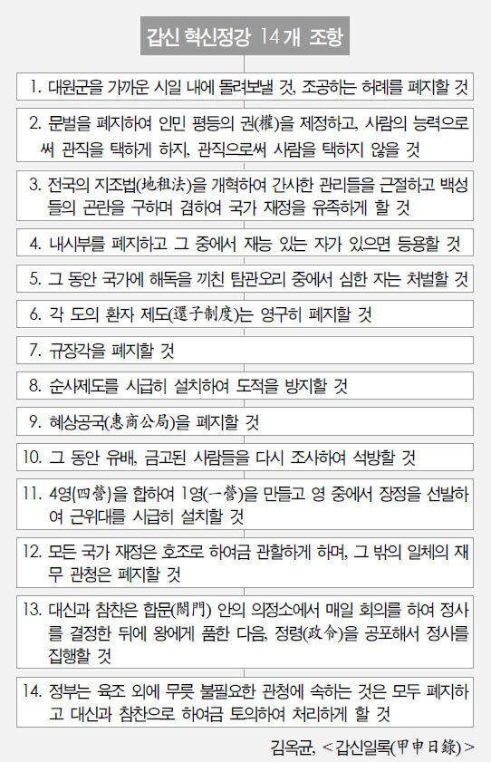 6일 오전 9시께에는 고종의 전교형식을 빌려 이를 공포했다. 이날 오후 3시에는 고종도 추인해 대개혁정치를 천명하는 조서를 내려 국정 전반의 대개혁이 이루어질 듯했다. 그러나 정변의 성공은 여기까지였다. 청군이 무력 개입을 시작한 것이었다.