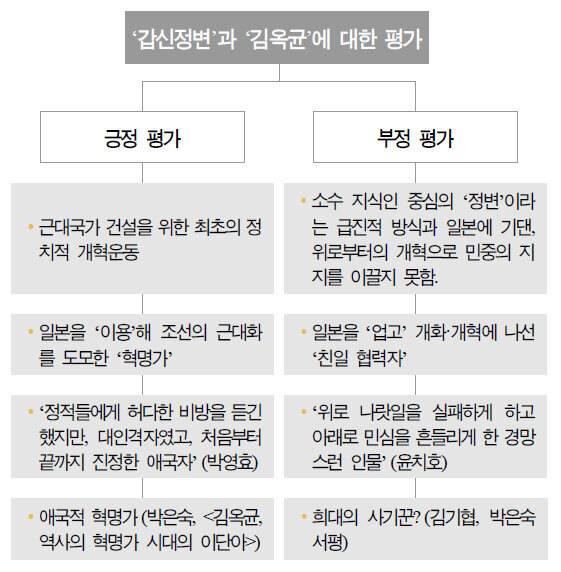 국사 교과서에서는 갑신정변을 ‘청의 간섭에서 벗어나 자주독립을 달성하고자 한, 우리나라 최초의 정치 개혁 운동’으로 평가한다. 그러나 ‘소수의 지식인이 중심이었고 정변이라는 급진적 방식을 택한 점’과 ‘일본의 군사적 지원에 지나치게 의존했던 점’ 등을 한계로 지적한다. 또 ‘농민의 염원이었던 토지 개혁에 소홀해 민중의 지지를 끌어내지 못했다’는 점도 결정적인 한계로 본다.