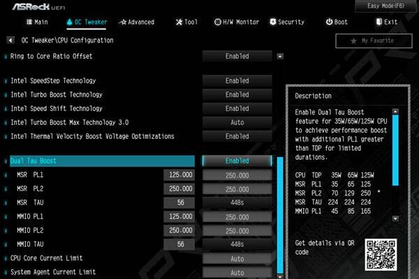 한편, ASRock B560M Pro4 디앤디컴 메인보드는 해당 카테고리에서 Dual Tau Boost 옵션으로 베이스 클럭을 제어하는 전력 제한(PL1)과 올 코어 부스트 클럭을 제어하는 전력 제한(PL2) 값 조절이 가능하다.