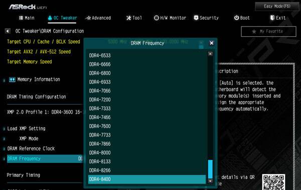 바이오스에서 XMP 기능을 이용해 간단히 오버클럭하거나, 수동으로 최대 DDR4 8400MHz까지 오버클럭할 수 있도록 옵션을 제공한다. 오버클럭 자체가 메인보드와 바이오스, 메모리, CPU 등 여러 요인이 작용하기에 모두가 높은 수준의 오버클럭이 가능하다 말할 수 없지만, 상당 수준의 메모리 오버클럭을 고려한 설정으로 보인다.