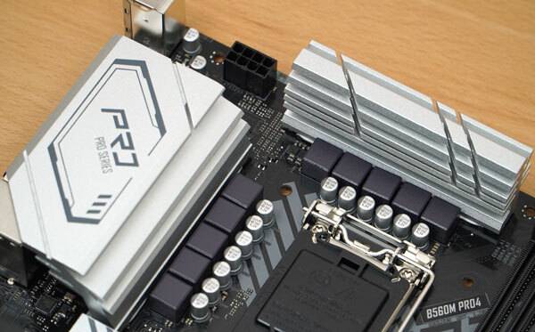 ASRock B560M Pro4 디앤디컴 메인보드는 RT3609BE 6+2 페이즈 구성이 가능한 RT3609BE PWM 컨트롤러와 4508NH/ 4503NH N-채널 모스펫, 50A 전력 대응이 가능한 초크 등을 결합한 8 페이즈 전원부가 구성되어 있다.