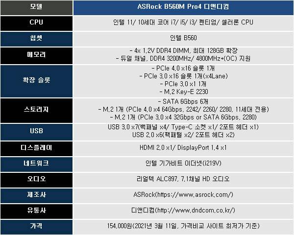 ASRock B560M Pro4 디앤디컴 메인보드는 USB 3.1과 USB 3.2 미지원이라는 점을 제외하면 11세대 로켓 레이크를 위한 B560 칩셋의 특징을 모두 지원하는 제품이다.