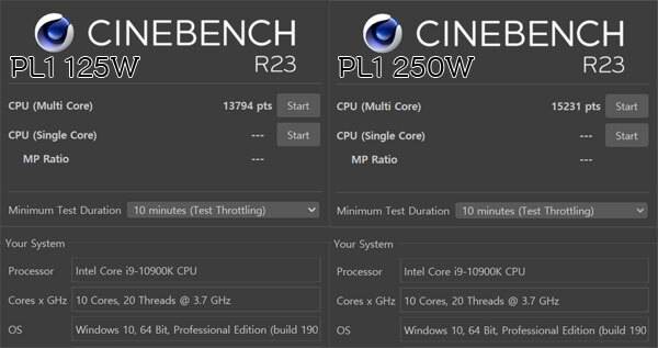 PL1이 125W인 기본 상태에서는 전력 스로틀링이 걸려 코어 i9-10900K의 성능을 제대로 활용하지 못했지만, PL1 값을 올코어 부스트 클럭 값인 250W로 높이자 시네벤치 R23 멀티 코어 테스트 기준 약 10%의 성능 향상을 경험할 수 있었다.