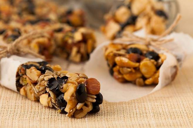 다이어트 간식으로 떠오르고 있는 ‘견과류바’는 각종 비타민과 항산화 물질이 뛰어나 건강에도 좋고, 간단하게 식사 대용으로 즐길 수 있는 간편 음식이다. 먼저 취향에 따라 원하는 견과류를 준비한다. 견과류가 잘 섞일 수 있도록 잘게 부셔준다. 오도독 씹는 식감을 살리고 싶다면 살짝만 부숴 넣어도 좋다. 달군 프라이팬에 물 1큰술, 설탕 1/2큰술, 올리고당 3큰술, 꿀 2큰술을 넣고 끓여준다. 어느 정도 끓으면 준비한 견과류를 붓고 섞어준다. 점성이 높아지면 보관 용기에 랩을 깔고 그 위에 꾹꾹 눌러 담는다. 냉장고에 30분 정도 보관한다. 먹기 좋은 크기로 잘라준다.