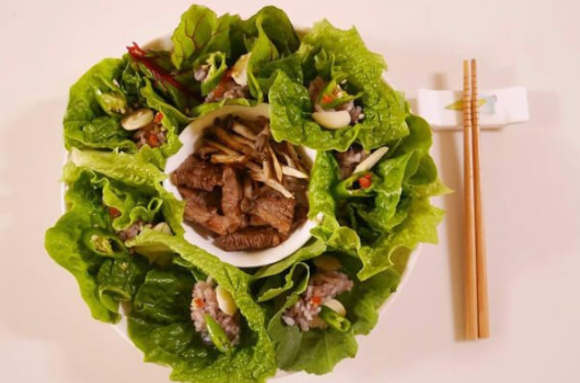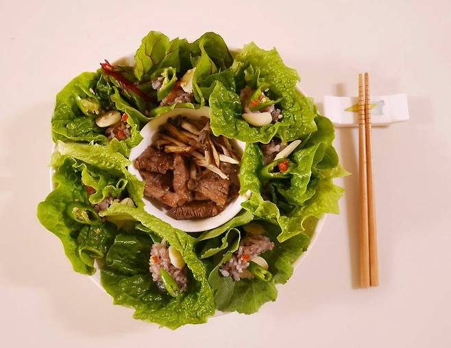 똑같은 다이어트 음식이더라도 조금만 플레이팅에 신경 쓴다면 보는 미각도 함께 만족시킬 수 있다. 다이어트 식재료로 많이 쓰이는 쌈 채소를 사용해 건강에도 좋고 보기에도 좋은 ‘상추꽃밥’을 만들어 보는 건 어떨까. 먼저 쌈 채소를 깨끗이 씻어 물기를 제거한다. 마늘, 고추, 버섯 등 부재료를 먹기 좋은 크기로 준비한다. 부드럽고 지방이 좋은 쇠고기 안심 부위를 달군 팬에 기름 없이 구워준다. 넓은 그릇을 준비하고 가운데 고기를 담은 종지 그릇을 올린다. 쌈 채소에 적당량의 밥, 고추, 마늘, 쌈장을 올린 후, 모양을 잡아 그릇에 하나씩 돌려 담는다.