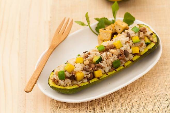 매일 똑같은 다이어트 음식이 지겹다면 화려한 비주얼이 돋보이는 애호박 볶음밥을 만들어보자. 먼저 깨끗이 씻은 애호박을 세로 길이로 잘라준다. 애호박은 배모양 살려 숟가락으로 속을 동그랗게 파낸다. 다른 애호박은 잘게 다져준다. 양파, 버섯, 청양고추도 잘게 다져준다. 달군 팬에 기름을 두르고 속을 파낸 애호박을 구워준다. 다른 팬에 준비한 채소를 볶아준다. 양파가 투명해지면 적당량의 밥을 넣고 같이 볶아준다. 소금과 후추로 간한다. 속을 파낸 애호박 안에 볶음밥을 넣어준다.