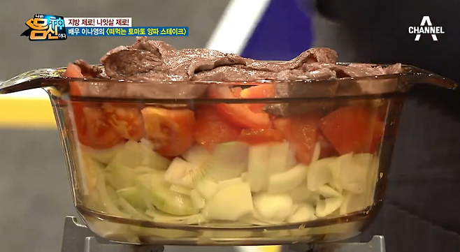 배우 이나영이 즐겨 먹는 다이어트 식단으로 화제 된 바 있는 ‘떠먹는 스테이크’. 토마토는 혈액순환을 도와 부종을 완화해 주기 때문에 체중 감량에 도움을 주고, 스테이크가 들어가 단백질을 보충해주므로 다이어트에 효과적이다. 먼저 양파는 적당 크기로 썰어준다. 토마토는 껍질을 벗겨 양파와 비슷한 크기로 썰어준다. 쇠고기 등신은 살코기만 분리해 달군 팬에 앞뒤로 노릇하게 구워준다. 냄비에 아래부터 양파, 토마토, 스테이크 순으로 넣어준다. 약한 불에서 끓이다가, 채소에서 물이 나오면 저어가며 약 2시간 정도 끓여준다. 시큼한 맛이 강하면 꿀을 살짝 넣어준다.