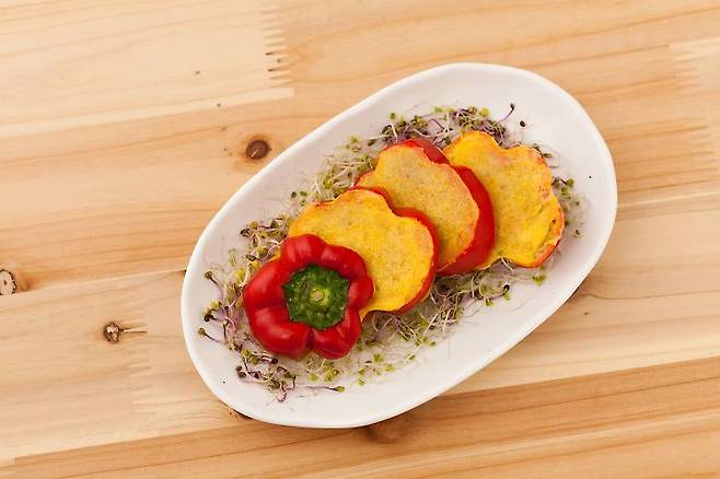 참치와 두부를 넣어 포만감을 주고 단백질도 보충할 수 있는 ‘파프리카 참치전’. 먼저 깨끗이 씻은 파프리카를 1cm 간격으로 잘라 링모양을 만들고, 씨는 발라낸다. 참치는 기름기를 완전히 제거한다. 두부를 물기를 꽉 짠 후, 칼등으로 으깨준다. 양파와 청양고추는 잘게 다져 준비한다. 볼에 참치, 으깬 두부, 양파, 청양고추를 넣고 고루 섞은 후, 밀가루 1큰술을 넣고 한번 더 섞어준다. 소금과 후추로 간한다. 달걀 2~3개를 풀어 달걀물을 준비한다. 썰어둔 파프리카 링 안쪽에 밀가루로 살짝 묻혀준다. 준비한 속재료를 가운데가 오목하도록 담아준다. 달걀옷을 입혀준다. 기름을 달군 팬에 앞뒤로 노릇노릇하게 익혀준다.