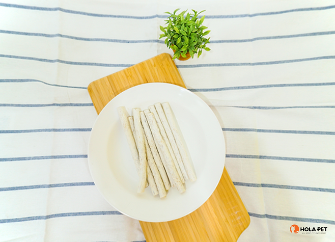 반려동물 간식 먹방 에디터답게 이번에도 봉지를 열었습니다. 먹어봐야 아니까요! 집었을 때 색소가 묻어나는지 먼저 확인했는데 아무것도 묻어나지 않았어요. 맛은 약간 짭잘했어요. (짠맛이 걱정 되는 분은 성분을 참고하시기 바라요)