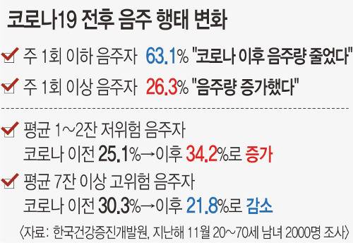 코로나19 유행에 따른 국민의 음주패턴 변화는 각종 조사에서 드러난다. 한국건강증진개발원이 지난해 11월 전국 20~70세 남녀 2000명을 온라인 설문한 결과 기존 주 1회 이하 음주자의 63.1%는 코로나19 이후 음주량이 줄었고 26.3%만이 증가했다고 답했다. 코로나 이후 음주량이 늘었다고 한 응답자의 54.1%는 “집에서 보내는 시간이 늘어서”라고 했다. 또 코로나19 이전 1회 술자리의 평균 음주량이 1~2잔에 해당하는 저위험 음주자는 25.1%였으나 코로나 이후 34.2%로 상승했다. 반면 코로나19 이전 평균 음주량이 7잔 이상인 고위험 음주자는 30.3%였으나 코로나 이후 21.8%로 감소했다. 코로나19가 지속될 경우 이처럼 조금씩 자주 마시는 경향이 점차 가속화될 가능성이 높다는 게 개발원 측 분석이다.
