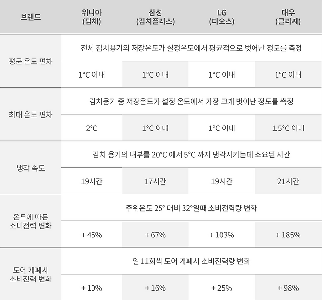 김치용기를 20°C 에서 5°C 까지 내리는데 걸리는 시간을 측정한 냉각속도는 삼성이 17시간, 위니아,/LG가 19시간 대우가 21시간으로 브랜드에 따라 작은 차이는 있었습니다.