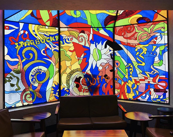 내부는 스테인드글라스로 꾸몄습니다. 카페가 아니라 성당에 온 것 같은 착각을 줄 만큼 멋지네요. 한쪽에 영문으로 적힌 스타벅스라는 글자가 색다르게 다가옵니다.