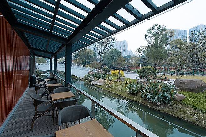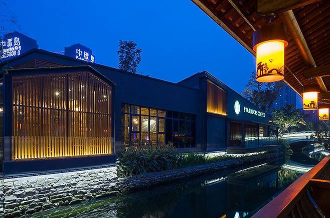 중국 청두에 있는 티엔푸 강변의 스타벅스입니다. 마치 한 폭의 수묵화와 같은 분위기를 자아냅니다. 강을 사이에 둔 두 개의 건물로 구성돼 있고 미닫이 창문, 중국식 등, 돌다리와 같은 요소가 동양적인 미를 전하도록 설계됐습니다.