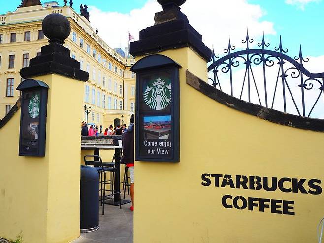 스타벅스 마니아 사이에서 ‘베스트 스벅 뷰’라고 불리는 곳이 있습니다. 체코를 대표하는 상징물인 프라하성 근처에 매장이 있어서 여행객들로 늘 북적이죠.