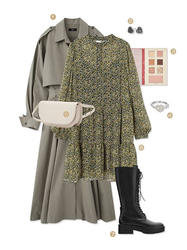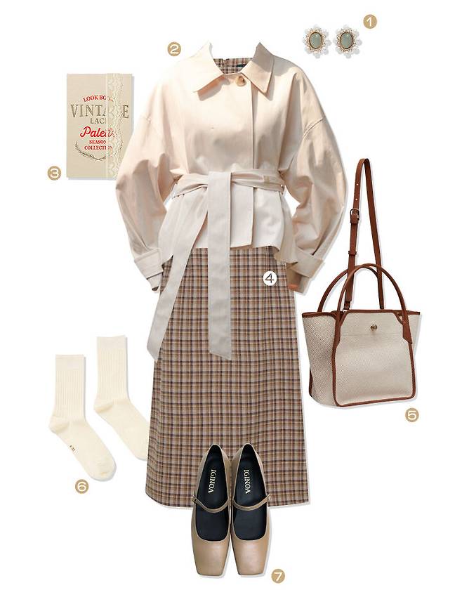 트렌치 코트를 얹은 빈티지한 코디.