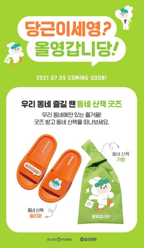 이번에 출시한 굿즈는 동네 산책 슬리퍼와 가방 2종이다. 동네 산책 슬리퍼는 당근마켓의 마스코트인 당근이 얼굴과, '당근이세요'와 '올리브영'을 조합한 '당근이세영?'이라는 재치 있는 문구를 넣었다. 동네 산책 가방에는 '올영갑니당' 문구와 함께 동네 산책 굿즈를 착용하고 올리브영으로 향하는 당근이의 모습을 담아 위트를 더했다. 슬리퍼와 가방은 모두 친환경 소재로 제작했다.