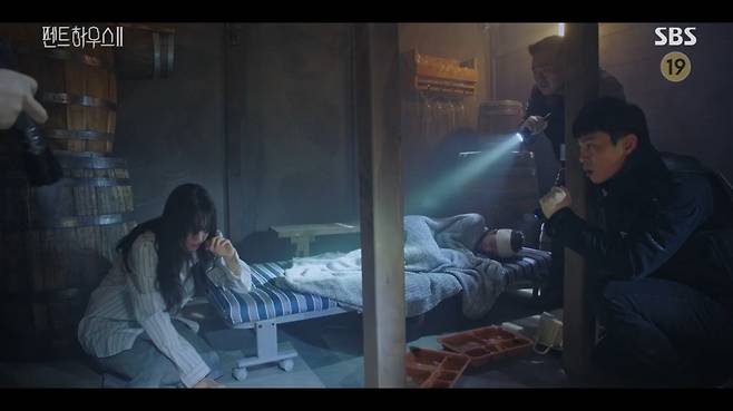 한편 경찰은 나애교가 머물던 별장을 수색하다가 지하 비밀통로를 발견했다. 인기척이 나 문을 열어본 그곳에는 행색이 엉망이 된 심수련이 "살려달라"고 밀고 있었다. 경찰은 주단태가 가둔 것으로 생각하며 "얼마나 여기 있었느냐?"고 물었고, 심수련은 "오늘 며칠이냐?"고 확인했다.