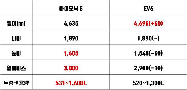 EV6 뒷좌석의 다리 및 머리공간 수치는 드러나지 않았다. 그러나 아이오닉 5보다 휠베이스와 차체 높이가 작다. 따라서 넉넉한 공간이 중요하다면 아이오닉 5가 나은 선택일 수 있다. 트렁크 용량(VDA 기준) 역시 아이오닉 5는 531L이며 2열을 접으면 최대 1,600L까지 늘어난다. EV6는 기본 520L이며 최대 1,300L다.