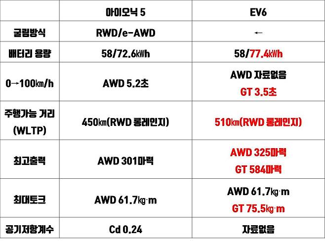 다음은 파워트레인 비교. 두 맞수는 각각 두 개의 배터리를 쓴다. 우선 스탠다드 모델은 두 차 모두 58㎾h 배터리를 품는다. 그러나 롱레인지 모델은 용량 차이가 있다. 아이오닉 5가 72.6㎾h, EV6가 77.4㎾h다. 따라서 1회 충전 주행가능 거리도 EV6가 더 넉넉하다. 최고출력은 AWD 롱레인지 기준으로 아이오닉 5가 301마력, EV6가 325마력이며 최대토크는 61.7㎏‧m로 같다.