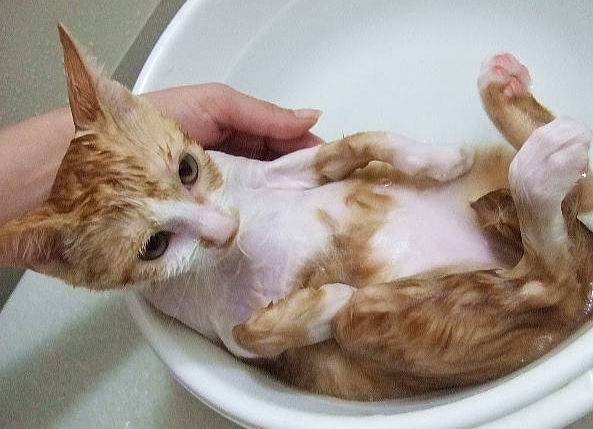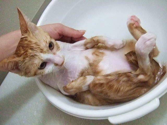 고양이는 소리에도 예민합니다. 목욕을 시킬 때는 샤워기를 이용하기보다 세면대에 물을 받아서 발부터 서서히 적셔서 고양이를 안심시킵니다. 이때 물의 온도는 고양이 체온과 비슷한 38℃가 적당하며 샴푸는 냄새가 없는 고양이 전용 샴푸를 사용해야 합니다.
