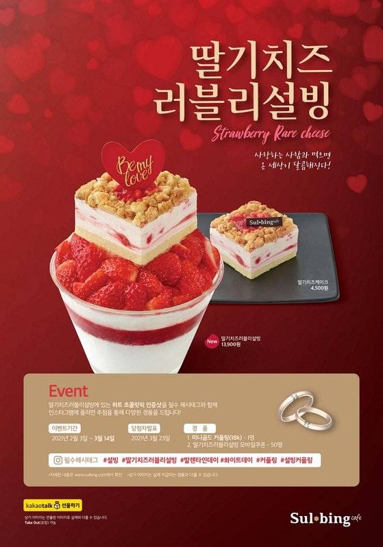 설빙은 이번 신메뉴 출시를 기념해 오는 3일부터 오는 3월 14일까지 사회관계망서비스(SNS) 이벤트를 진행한다. 딸기치즈러블리설빙 속 하트 초콜릿픽을 활용해 인증사진을 촬영하고, 필수 해시태그(#설빙 #딸기치즈러블리설빙 #발렌타인데이 #화이트데이 #커플링 #설빙커플링)와 함께 개인 인스타그램 계정에 업로드하면 추첨을 통해 미니골드 18K 커플링(1명)과 딸기치즈러블리설빙 모바일 쿠폰(50명)을 제공한다.