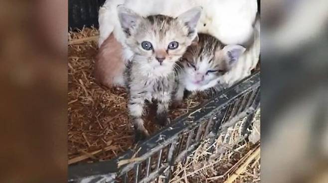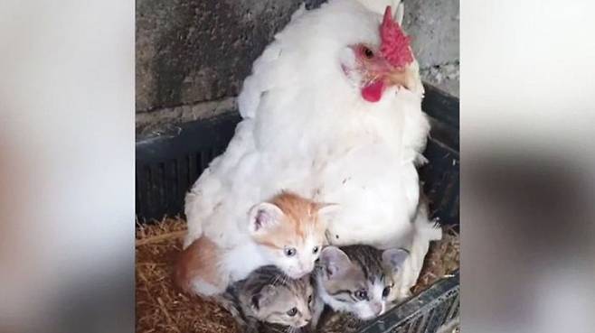 암탉은 고양이들이 마치 자기 새끼인 것처럼 따뜻하게 품어주고 있었는데요.