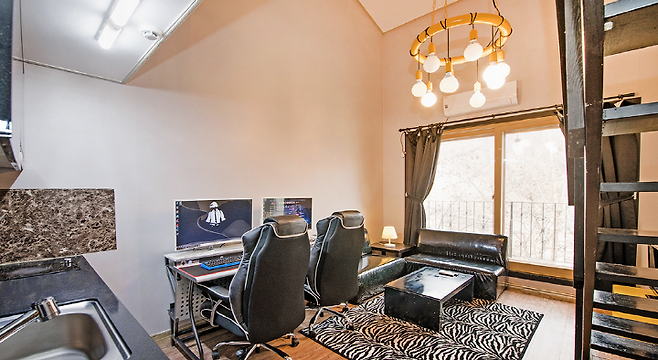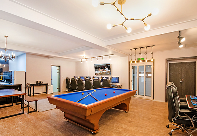 키보드, 마우스, 의자까지 PC방을 완벽하게 구현한 게임룸이다. 고사양을 요구하는 ‘배틀그라운드가 잘 돌아가며, 롤, 피파 등 여러 인기 게임들도 준비되어 있다. 게임을 좋아하는 커플들은 주로 커플 PC가 준비되어 있는 복층 게임룸이 적합하다. 친구들과 묵기에는 여러 대의 PC가 있는 B-1, R-1 객실을 추천한다.