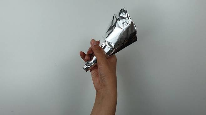 또 신박한 재료로 깔때기를 만들 수 있어요. 바로 설레임 아이스크림 팩인데요! 팩의 밑부분을 잘라 주기만 하면 끝! 뚜껑이 달린 부분이 바로 우리가 사용할 수 있는 일회용 깔때기에요.
