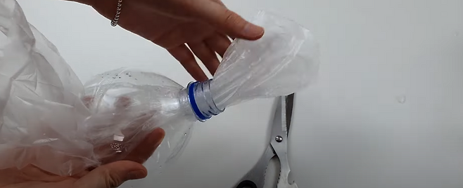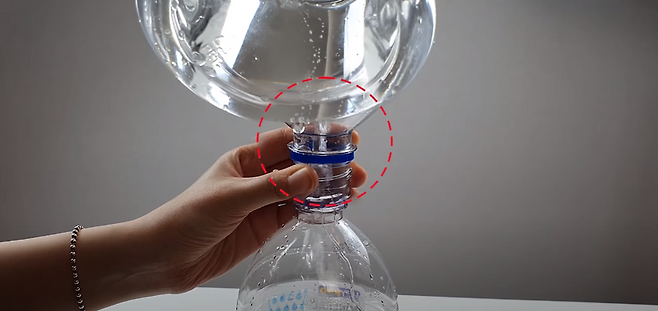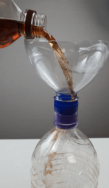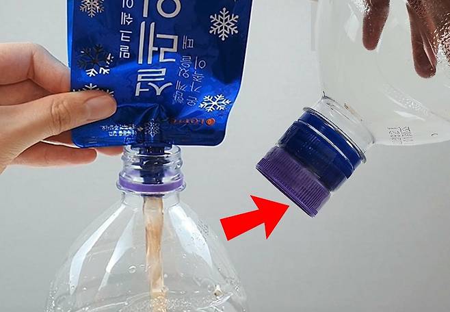 페트병 깔때기를 이용할 때 한 가지 꿀팁이 있는데요. 페트병 깔때기를 통해 다른 페트병에 내용물을 옮기다 보면 입구 크기가 비슷해서 내용물이 흐르는 경우가 생길 수 있어요. 그럴 때는 일회용 비닐 봉지를 이용하면 돼요.