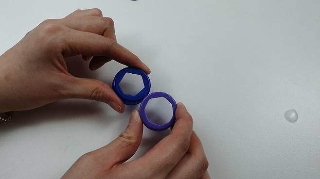 이것보다 손이 가지만 만들어두면 더 편리한 방법도 있어요. 바로 페트병의 뚜껑을 활용하는 건데요. 우선 페트병 뚜껑 두 개를 준비해주세요. 그리고 두 개 모두 칼로 십자 모양을 내주세요. 그다음 조심히 테두리를 따라 잘라내면 됩니다.
