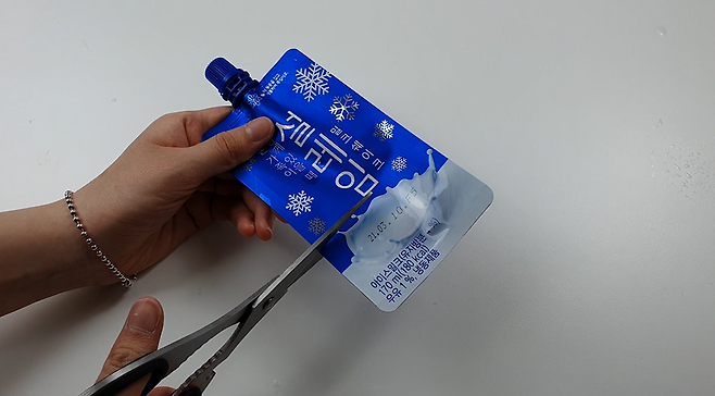 대신 이 팩을 깔때기로 사용하기 위해서는 우선 아이스크림이 묻은 속을 씻어줘야겠죠? 팩을 잘라뒀으니 입으로 먹는 쪽 뚜껑을 열어 흐르는 물로 여러 번 씻어주시면 된답니다.